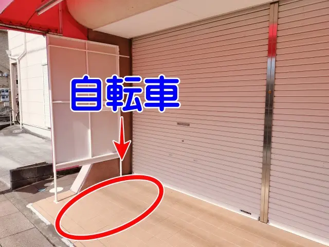 自転車でお越しの方へ。オカダ洋品店前に駐輪してください。
