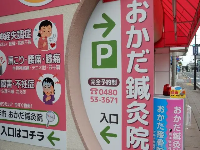 おかだ鍼灸院は、埼玉県幸手市の生活道路に面した商店街沿いにあります。