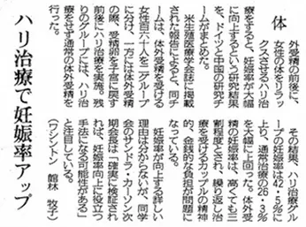 米生殖医療学会誌に掲載された報告によると、同チームは、体外受精を受ける女性百六十人を2グループに分け、一方に体外受精の際、受精卵を子宮に戻す前後ハリ治療実施。残りのグループには、ハリ治療をせず通常の体外受精を行った。
