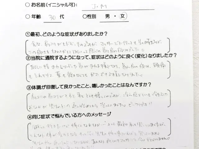 恥ずかしい程まわらなかった首がまわる様になり、首や肩の痛み、頭痛もとれてきて薬も飲まなくてもガマンできる様になりました。