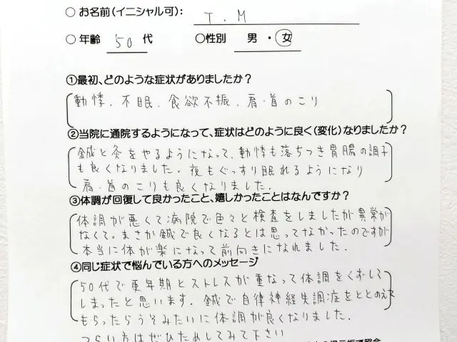 鍼と灸をやるようになって、動悸も落ち着き胃腸の調子も良くなりました。