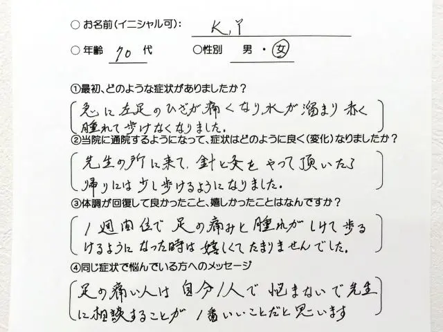 先生の所に来て、針と灸をやって頂いたら帰りには、少し歩けるようになりました。
