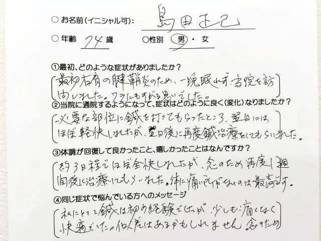 最初、右肩の腱鞘炎のため、一晩眠れず当院を訪問しました。
